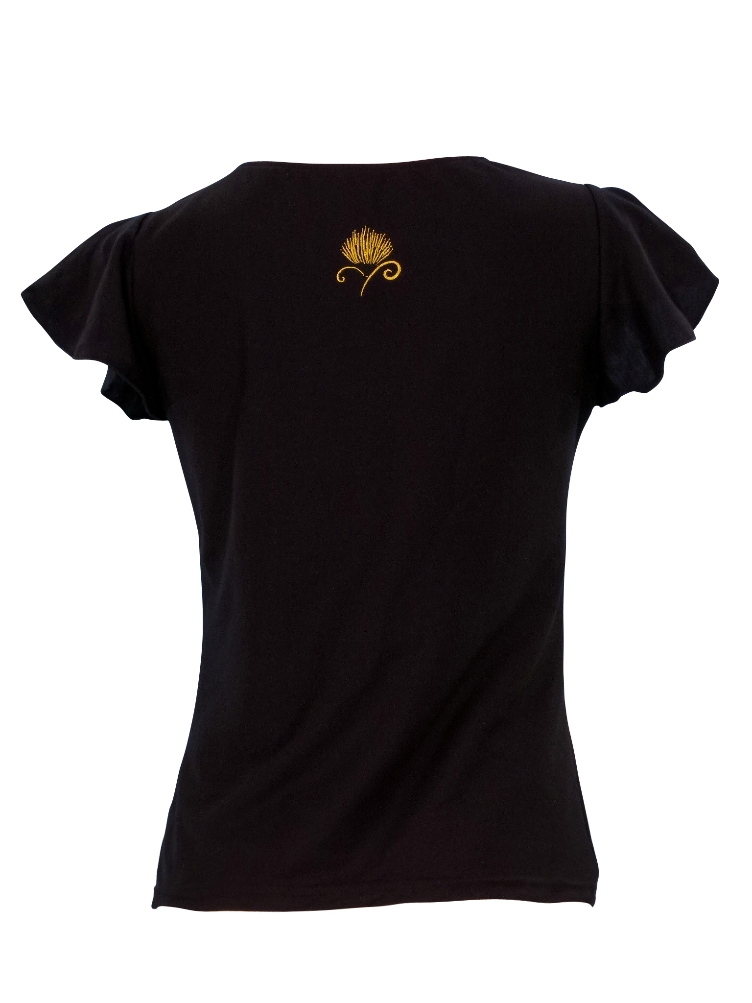 - Gold embroidery on black T-shirt