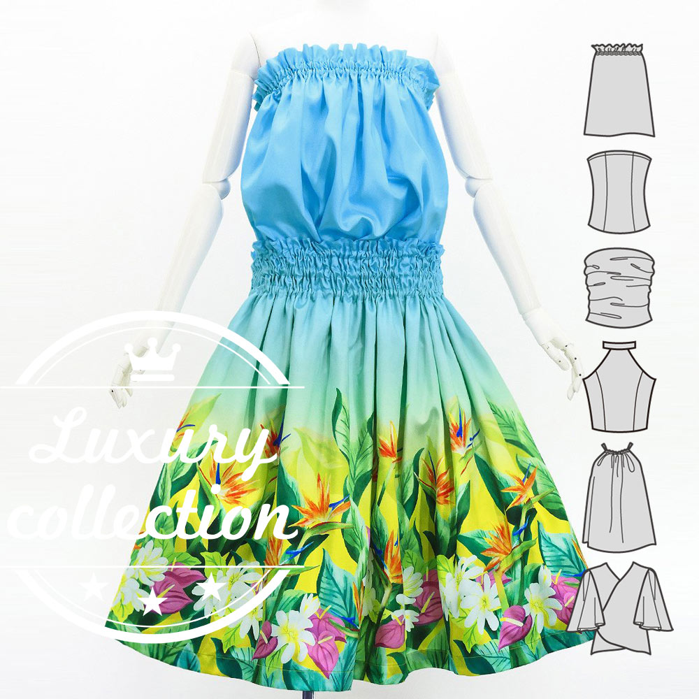 Hula Blouse & Pa'u Set-Up with Hawaiian Flower & Leaf Print / Luxury Collection