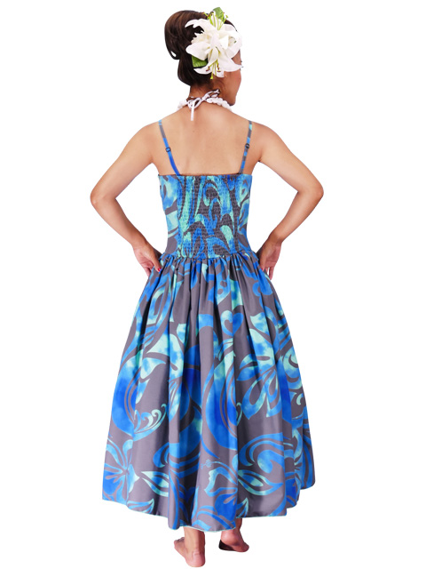 - Hula Midi Dress with Hibiscus Print / Gray & Blue