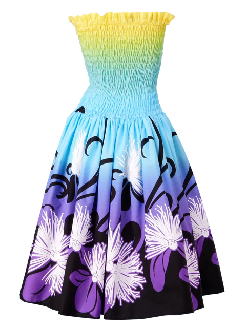 - Hula Gradation Midi Dress with Lehua Print / Yellow, Blue & Purple