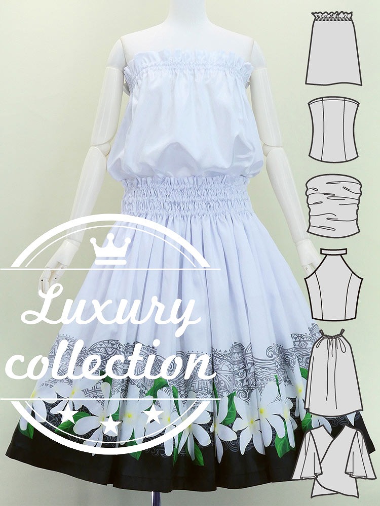 - Hula Blouse & Pa'u Set-Up with Tiare & Kahiko Print / Luxury Collection / J3097whbk